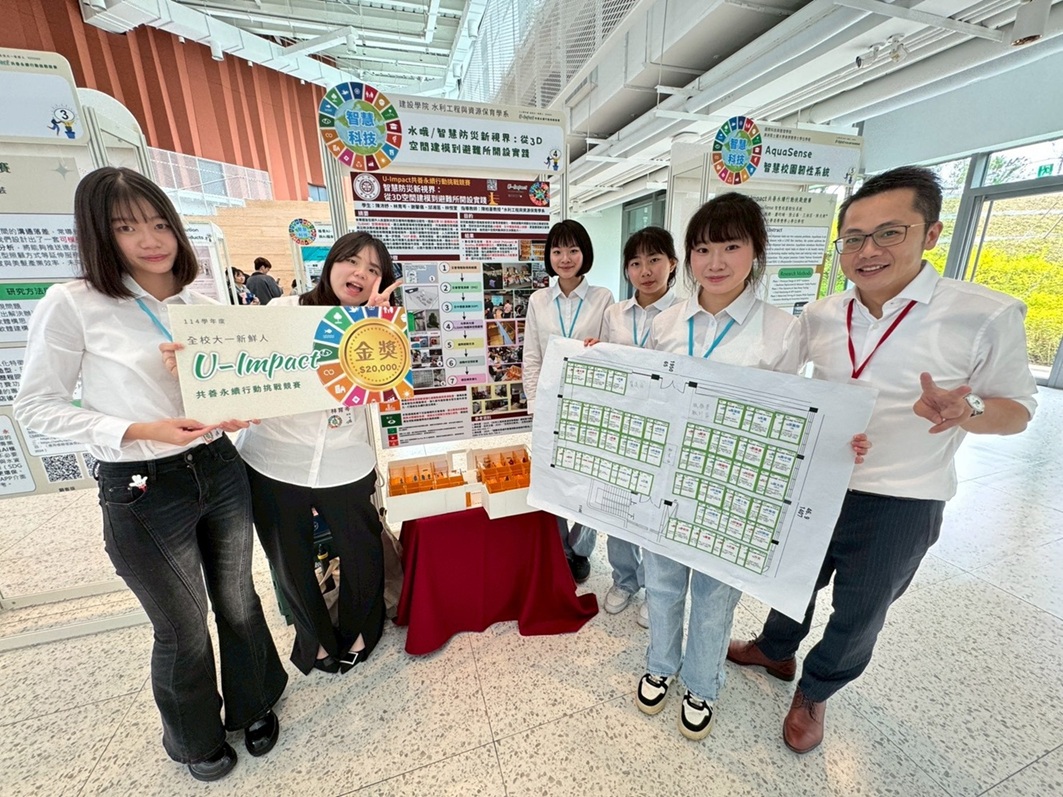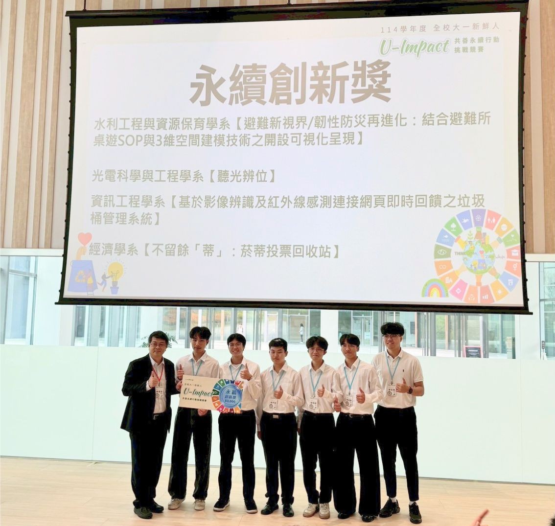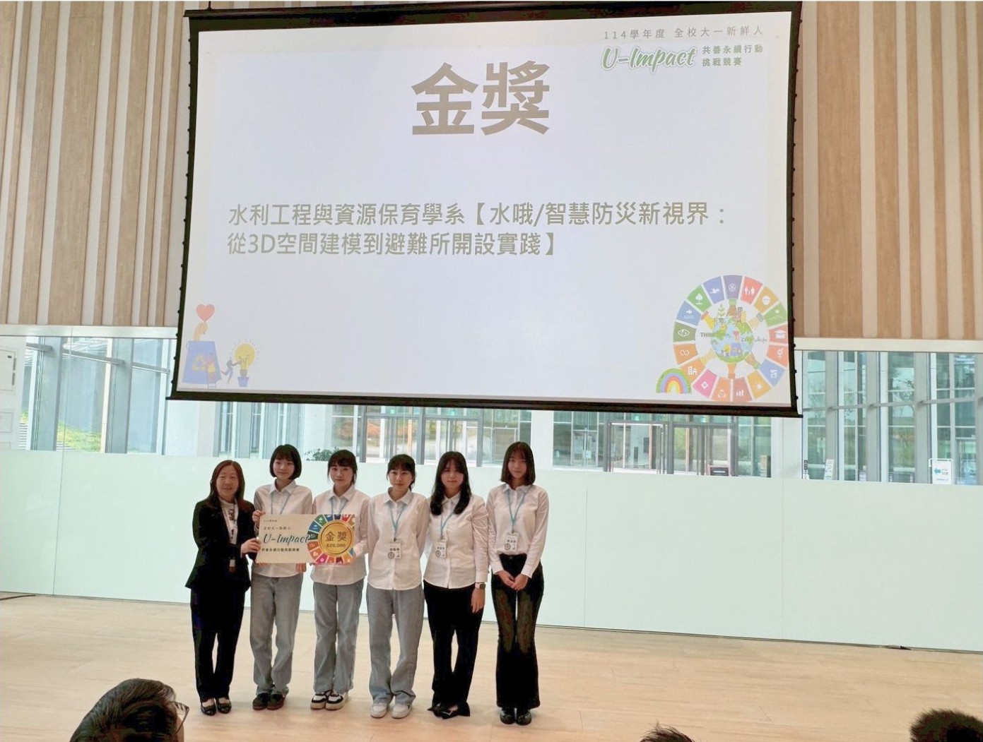 逢甲大學水利工程與資源保育學系學生團隊於114學年度「U-Impact共善永續行動挑戰競賽」中表現亮眼,在陳柏蒼老師指導下,水利系新生兩組代表分別榮獲金牌及永續創新獎,展現本校於智慧防災與永續教育領域之教學成果,並體現逢甲大學強調跨域學習與實作導向之教學特色。